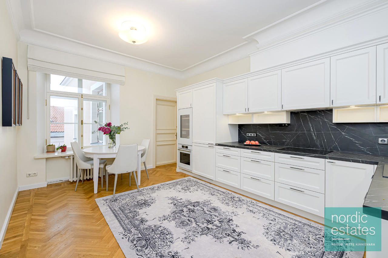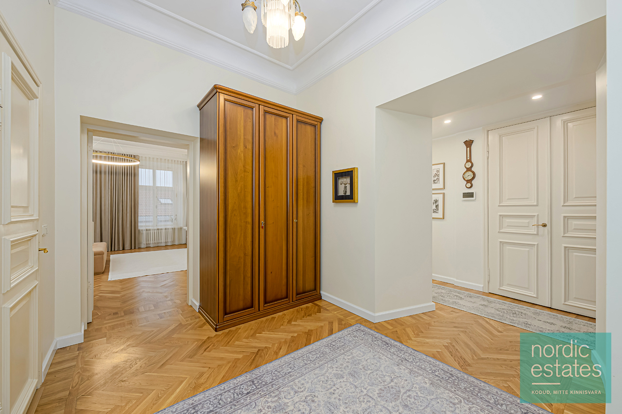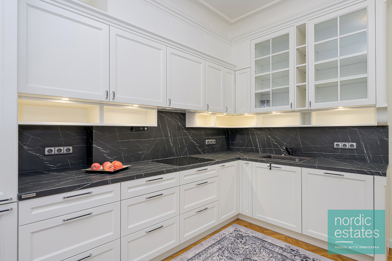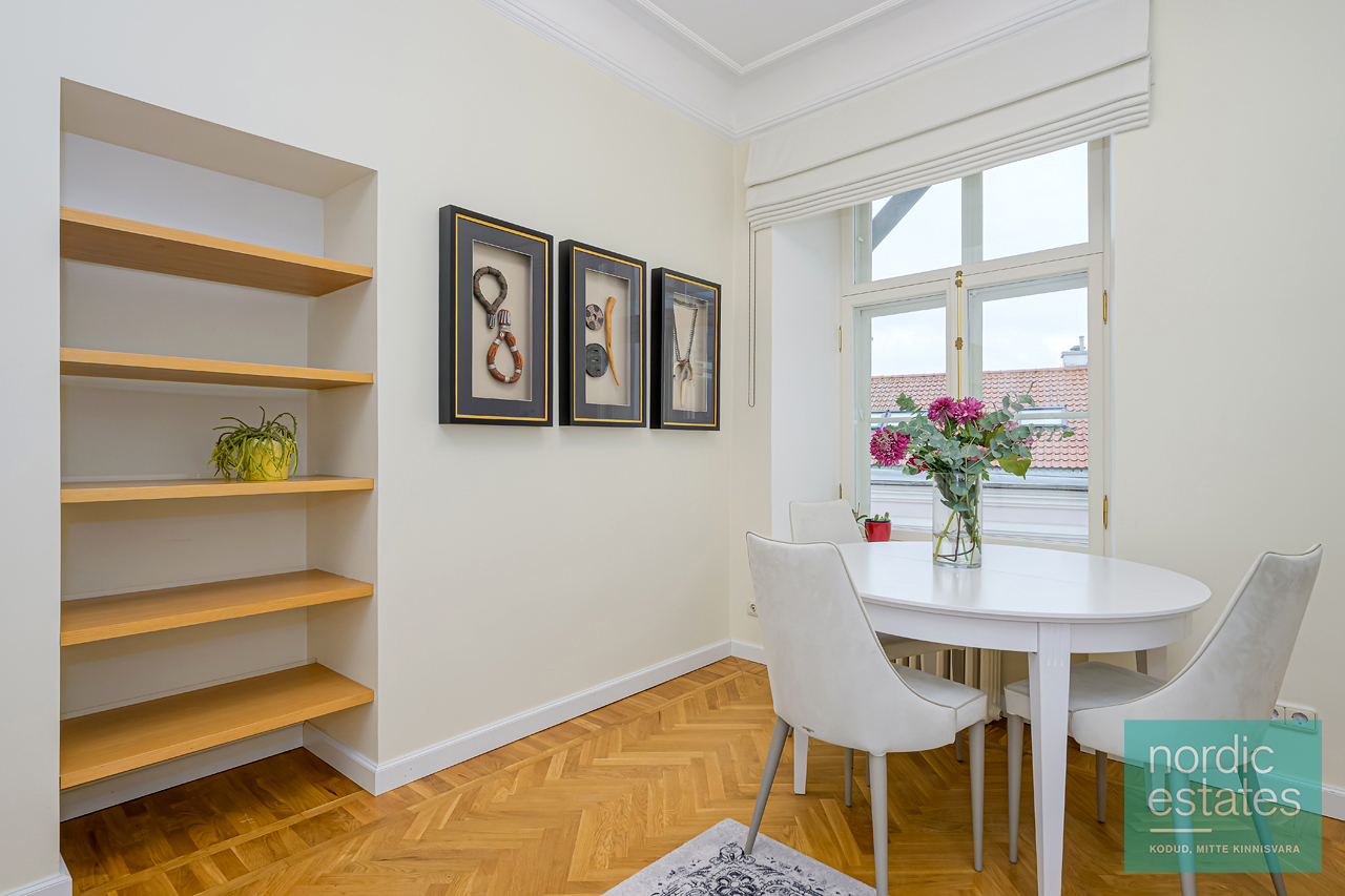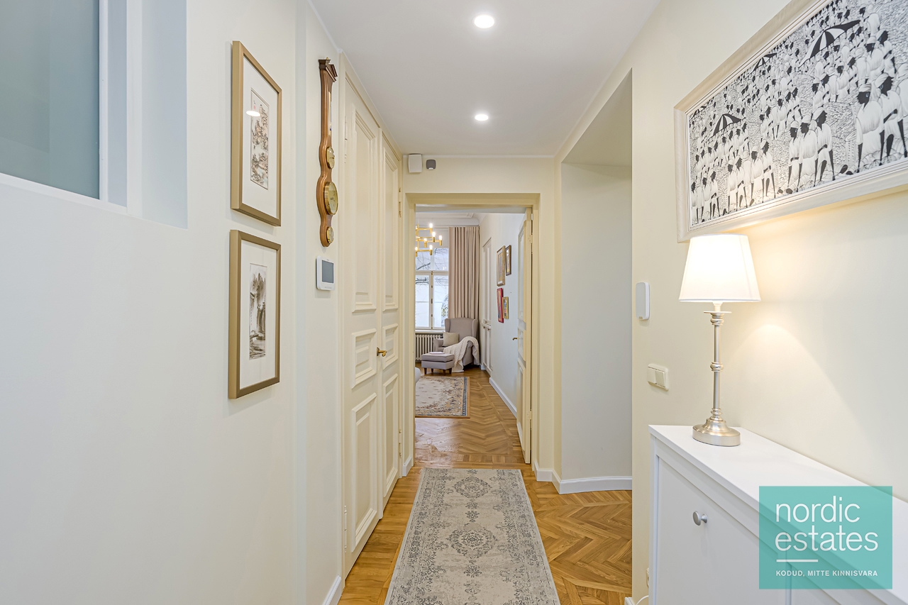 KORTER on läbi maja planeeringuga, aknad vaatavad kahte suunda, asub maja viimasel korrusel. Kogu korter on renoveeritud täielikult aastal 2021. Üürnikul on võimalus üürida korterit nii möbleeritult (fotodel) või möbleerimata. Korteris olev mööbel on valminud eritellimusel. Veinisõbrad hindavad veinikülmiku olemasolu, lisaks on köögis kogu tehnika, et valmistada ette üks tore perekondlik koosviibimine või korraldada kasvõi pritvaatsem vastuvõtt. Soliidsust ja väljapeetust leiad igal sammul. Hubasteks õhtuteks kahhelkividest ahi. Lastetuba on soovi korral ringi kohendatav ka kabinetiks ja/või külalistetoaks. Vannituba pakub nautlemist ja päevaväsimuse mahalaadimise võimalust.